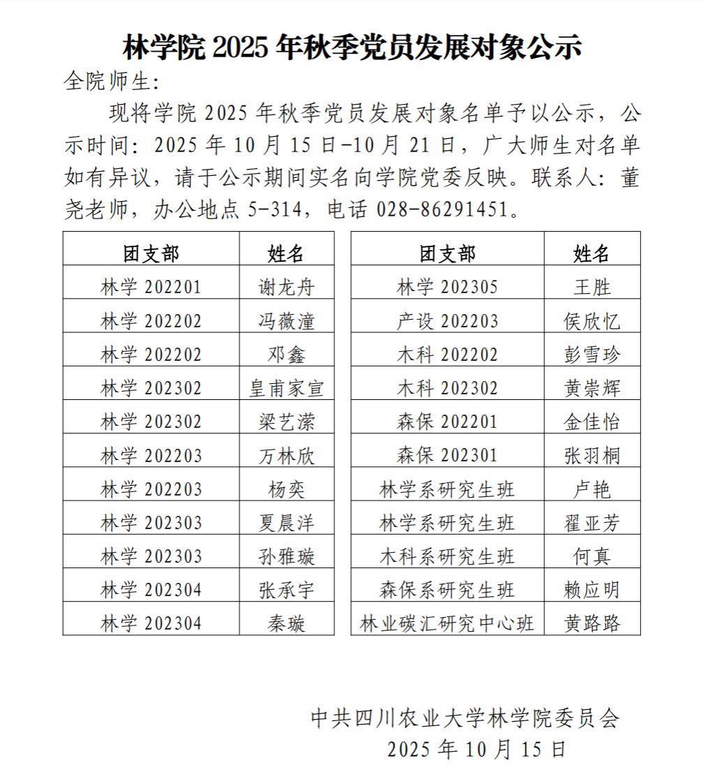 林学院2025年秋季学期入党积极分子培训班学员推荐名单公示