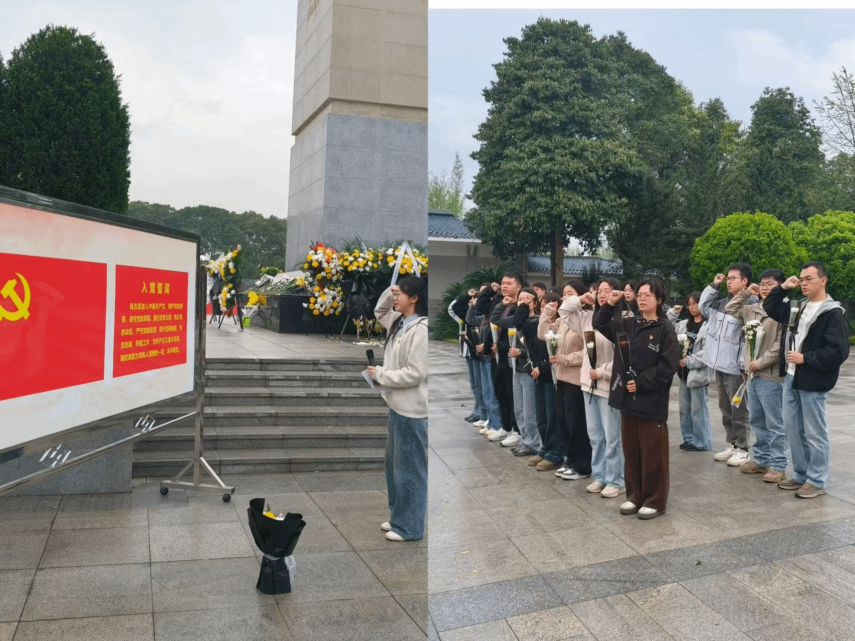 上午10时,全体党员同志和积极分子整齐列队,庄严肃穆。在主持人的带领下,首先在纪念碑前默哀三分钟并鞠躬致敬,表达对英烈们的感恩与敬仰之情。同时,由党支部书记杨诗莹同志作为领誓人,带领全体党员面向党旗重温入党誓词,铿锵有力的誓言在陵园内回荡,彰显了党员们的坚定信仰和忠诚担当。