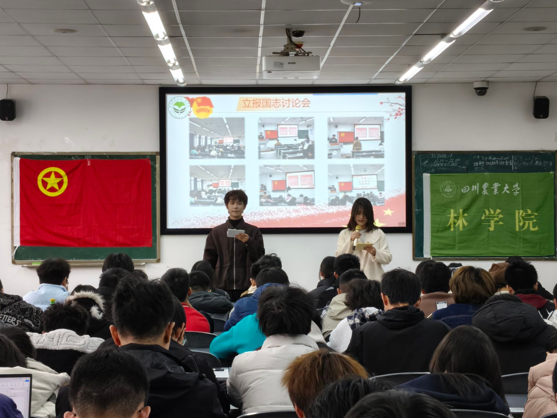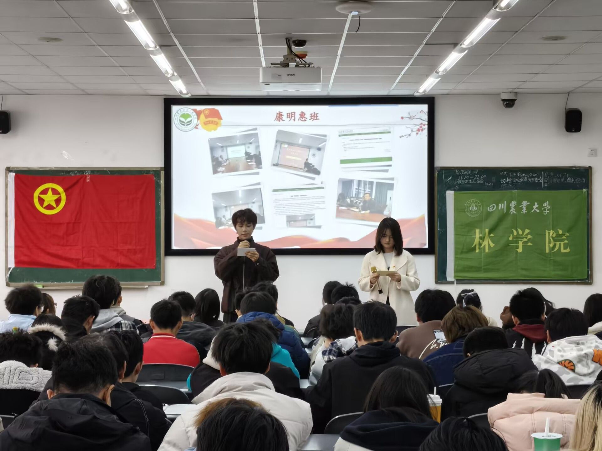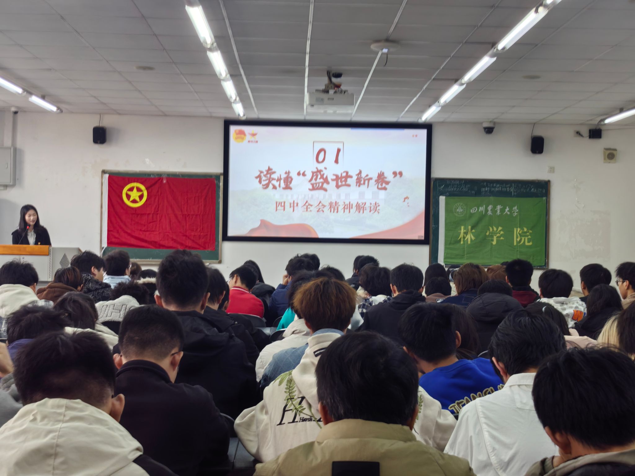 为深入学习领会党的创新理论,引导林学院青年将个人成长融入国家发展大局,2025年12月2日下午16:20,林学院“深悟全会精神,奋进崭新征程”示范性班团活动在4-B504教室隆重举行。本次活动由林学院团委直属部门流动团支部牵头,联合林学202303班、林学202501班、林学202506班、木科202501班、木科202502班等支部共同开展,通过四个精心设计的篇章,为近200名同学带来了一场多维度的思想洗礼。