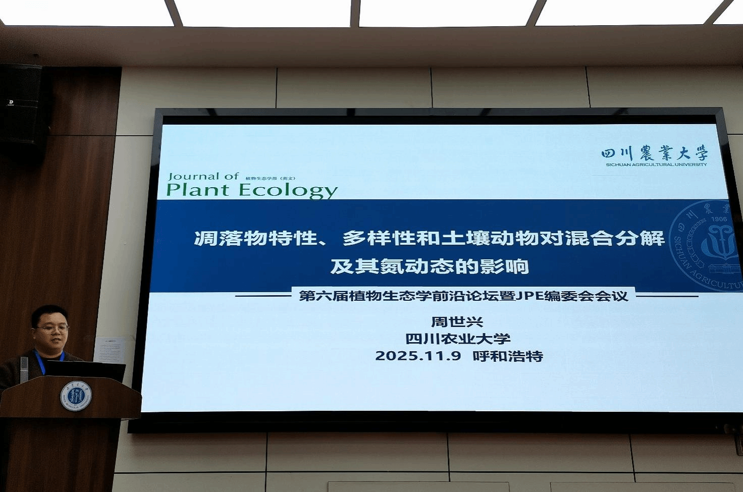 本次论坛聚焦植物生态学前沿,邀请了19位专家做特邀报告,共设置了“生物多样性与生态系统功能”、“生物地球化学循环及其驱动机制”、“生态系统对全球变化的响应”和“生态学理论方法与应用”4个专题,共计90余场学术报告。周世兴博士主持“生物地球化学循环及其驱动机制”专题分会场并作题为“凋落物特性、多样性和土壤动物对混合分解及其氮动态的影响”的专题报告,全面而深入地分享了团队在植物生态学领域的最新进展和研究成果,与参会人员进行了深入交流,互动解答了相关问题,取得了良好反响。据悉,JPE于2008年创刊,由中国植物学会与中国科学院植物研究所主办,牛津大学出版社出版,2019和2024年两次入选“中国科技期刊卓越行动计划”,在2025年中国科学院期刊分区中位列环境科学与生态学大类1区Top,也是林学、植物科学和生态学小区的1区期刊,是国际植物生态学领域的重要学术平台。此次论坛为生态学领域的学者搭建了高水平学术交流平台,有助于交流分享植物生态学领域的新观点、新思路和新方法。