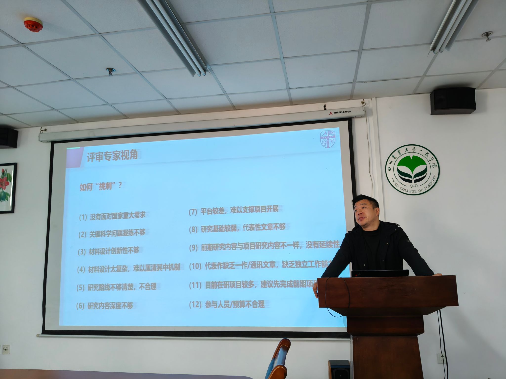 会上,科技处副处长周伟立足国家科研政策导向,系统解读了2026年国家自然科学基金申报的最新政策变化、限项规定、材料审核标准及评审流程。他结合学校申报整体情况,针对林学领域申报特点,强调了选题与国家战略需求的契合度、申请代码的精准匹配等关键要点,为教师们规避申报误区提供了权威指引。