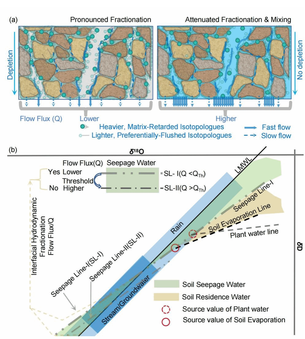 为解释上述现象,研究创新性地提出了“界面水动力学分馏”(IHF)理论假说。该机制认为,当水流经土壤孔隙时,由于轻、重同位素水分子与土壤颗粒界面的微观相互作用存在差异,会在不同流速下发生“分选”,从而导致同位素分馏。这一发现突破了传统认知中仅以蒸发过程主导水同位素分馏的解释框架。基于此,研究进一步提出了可与经典“蒸发线”并列的“渗流线”概念,为利用稳定水同位素精准示踪和刻画水循环路径提供了更完善的理论工具。