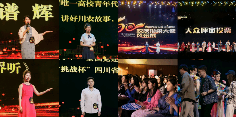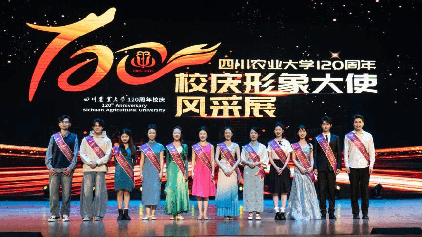 经过第一轮“初绽锋芒”个人风采与才艺展示和第二轮“巅峰对决”限时拉票的激烈比拼,结合综合评委与大众评审的现场投票,最终林学院森林培育专业木科系2023级博士陈果希、经济学院农村与区域发展专业2025级博士李沁娟、经济学院区域经济学专业2024级硕士张芮槐、管理学院农林经济管理专业2025级硕士林叶子、艺术与传媒学院数字媒体艺术专业2024级1班本科生田原、经济学院农村发展专业2024级硕士徐星宇、动物医学院动物药学专业兽医学2024级1班硕士程瀚砚、土木工程学院给排水科学与工程专业2023级2班本科生范亦丹、环境学院环境工程专业2023级1班本科生蒋亚楠、商旅学院旅游管理专业2024级2班本科生顾翊浩、食品学院食品质量与安全专业2025级2班本科生王小麦、法学院社会工作专业2025级2班本科生何思钰12名同学斩获“四川农业大学120周年校庆形象大使”称号。他们中,既有2026全国最美大学生候选人、央视《中国诗词大会》第十季第五名的林学博士,也有中国大学生自强之星、全国党建工作样板支部书记、全国学联第二十八次代表大会代表、共青团第十九次全国代表大会代表、四川省学联主席;既有全国优秀青年志愿者、北京冬奥会开幕式舞蹈表演者、成都大运会开幕式火炬手,也有全国青马工程学员、团中央“两弹一星”宣讲团成员、省委宣讲团成员、研究生支教团成员,更不乏科研、文艺、新媒体领域的校园达人。他们以过硬的综合素养、鲜明的青春特质与深沉的爱校情怀,成为百廿校庆最亮眼的青春名片。